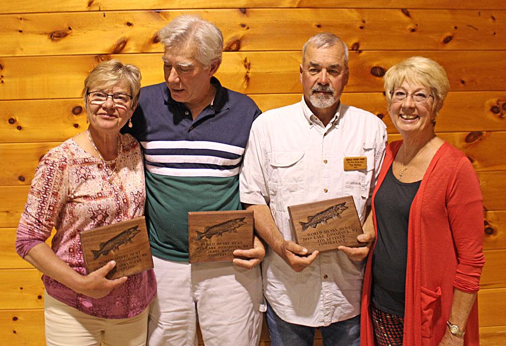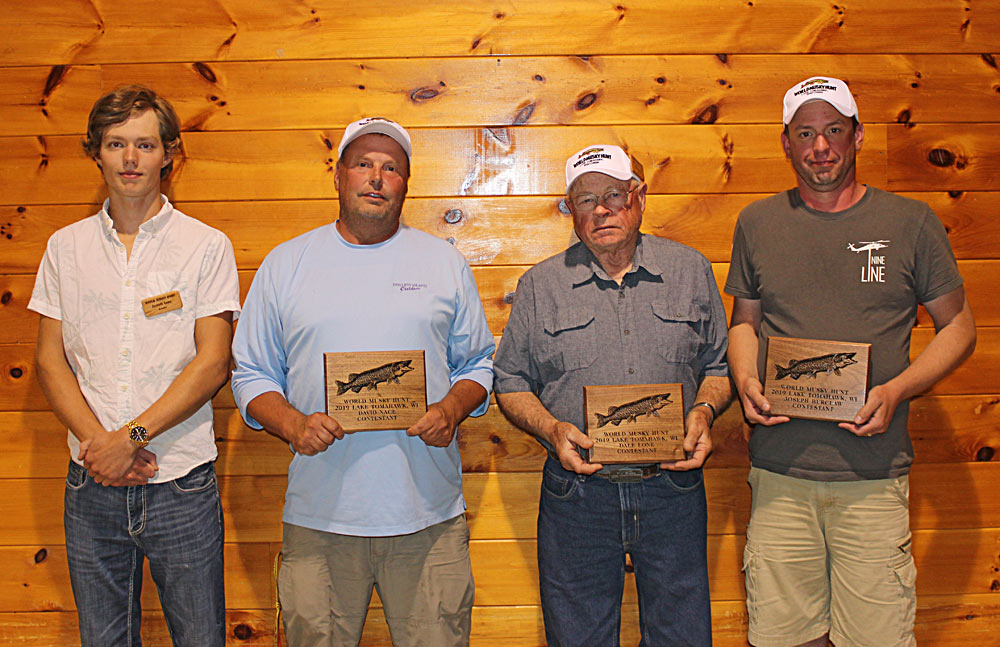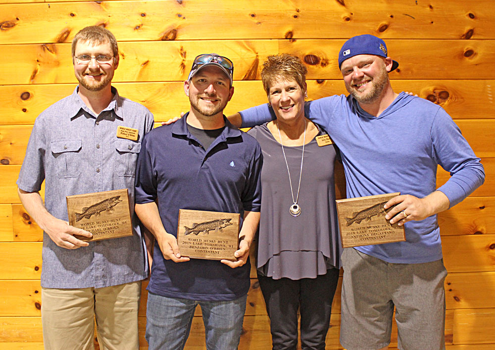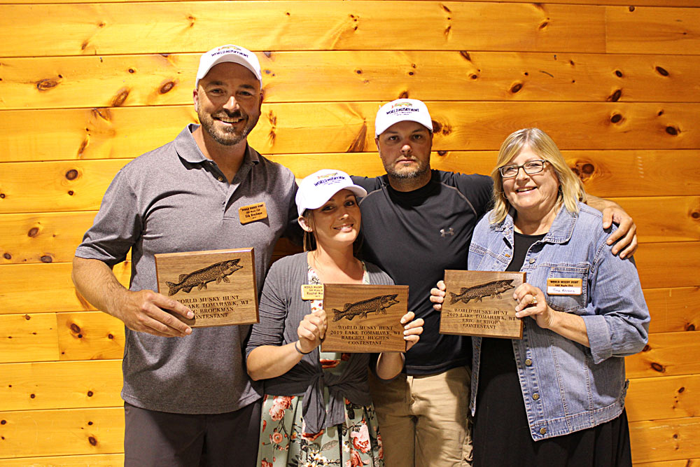 Musky Mike's Meatheads (from left) Michael O'Brien, Benjamin O'Brien, Greeter Julie Steebs, Anthony DeGaetano 2019 WMH Winning Team Kwik Hooks II (from left) Greeter Janelle Lone, Carl Rick, Nick Newman, Lyle Blum 2019 Trig's Military Team (from left) Greeter Jarrett Lone, David Nance, Dale Lone, Joseph Burclaw Esox Entourage II (from left) Duane Dolen