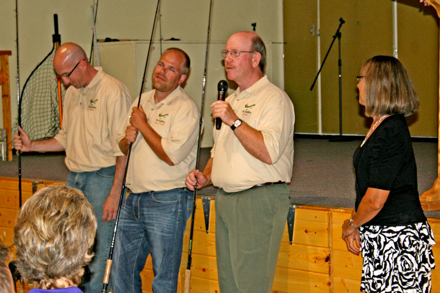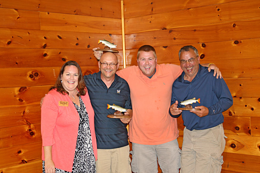 Team Trigs - Greeter Angel Steckbauer, Brian Marks, Kay Marks, Bill Goetz Nemo's Subway - Grant Johnson, Chad Levendowski, Butch Levendowski, Greeter Donna Rickman Team Wisconsin  -  Jeanie Pomplun, Craig Kasten, Clifford Bembenek,  Greeter Stephanie Sowatzka Winning Contestant Guide Mark McCumber with WMH President Ron Rickman